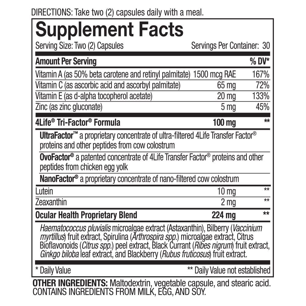 Elaborado para no perder detalle. 4Life Transfer Factor Vista ofrece respaldo específico para el desempeño visual y la salud ocular para que no pierdas cada pequeño detalle que le da belleza a la vida. Vista contiene la marca de luteína más recomendada por los médicos, la cual provee una protección crucial en el área de la mácula ocular y ofrece beneficios antioxidantes. Otros antioxidantes importantes como los extractos de mirtilo y grosella negra respaldan la agudeza visual saludable. Vista también contiene 4Life Transfer Factor® para educar y mejorar el sistema inmunitario, y vitaminas A, C y E para respaldo adicional contra los radicales libres. Toma dos (2) cápsulas diarias que te ofrecen nutrientes cruciales para una salud ocular óptima.* 4Life Transfer Factor Vista viene en cápsulas de origen vegetal.